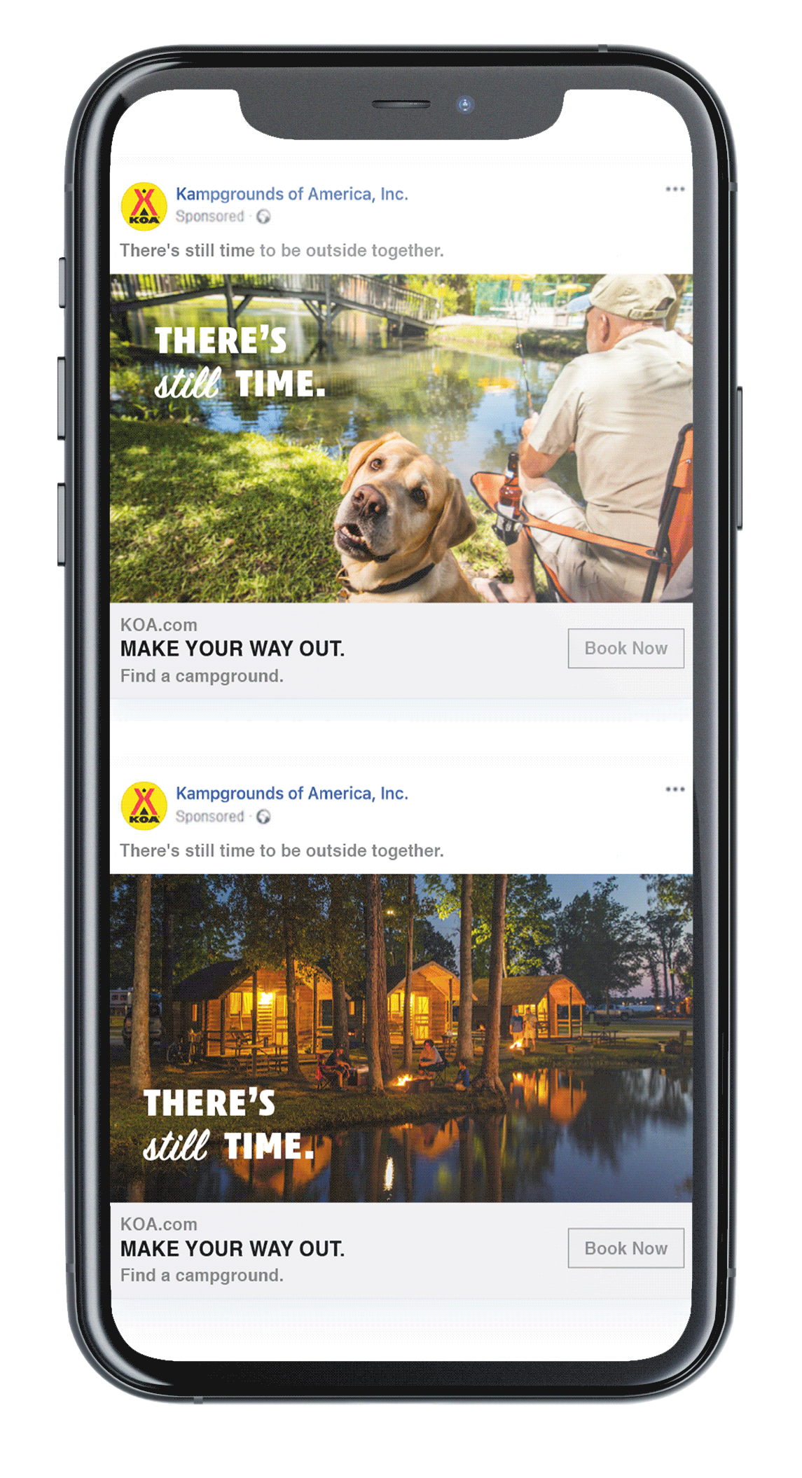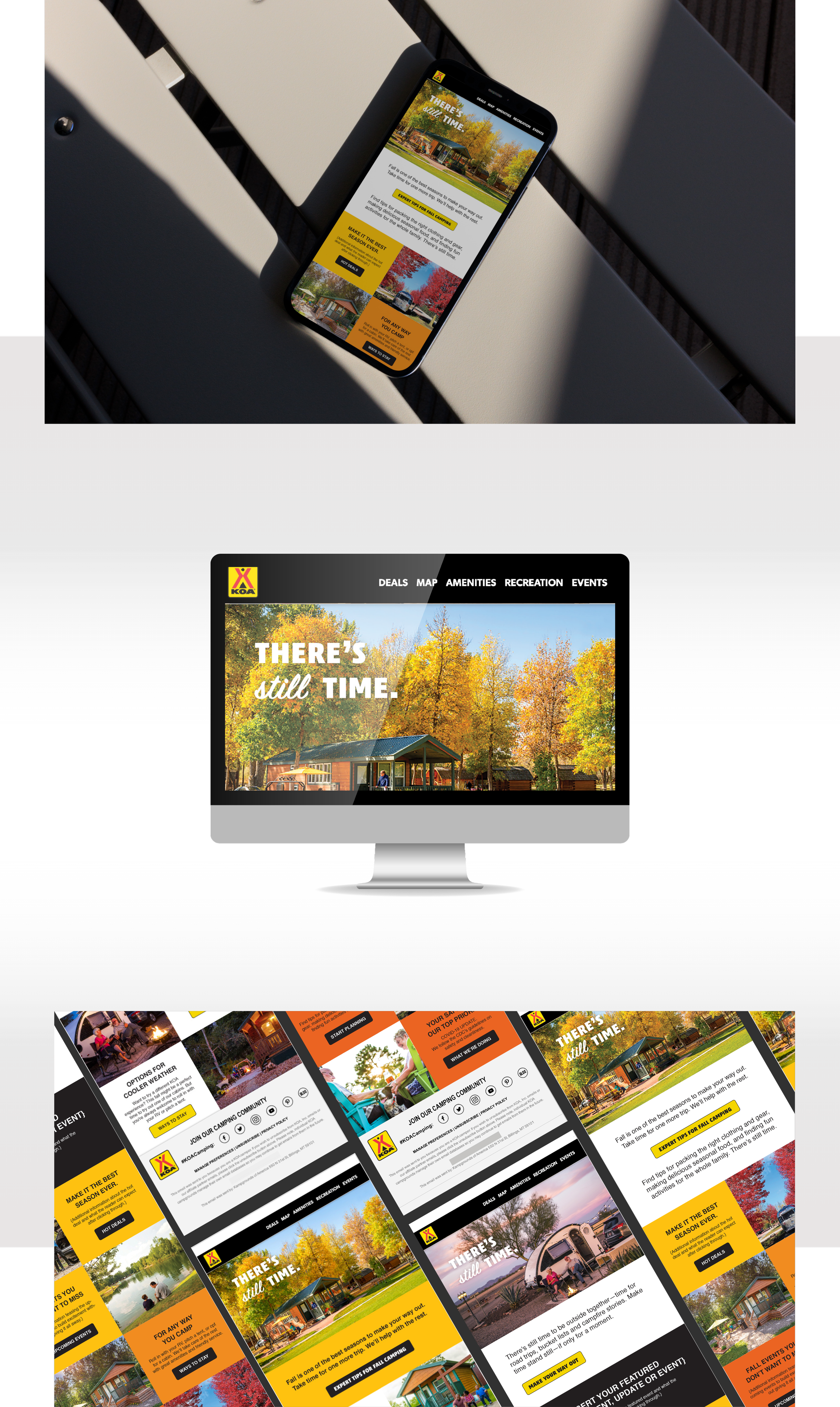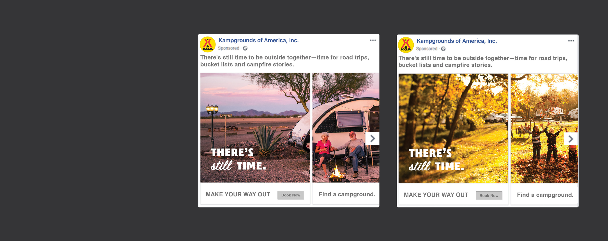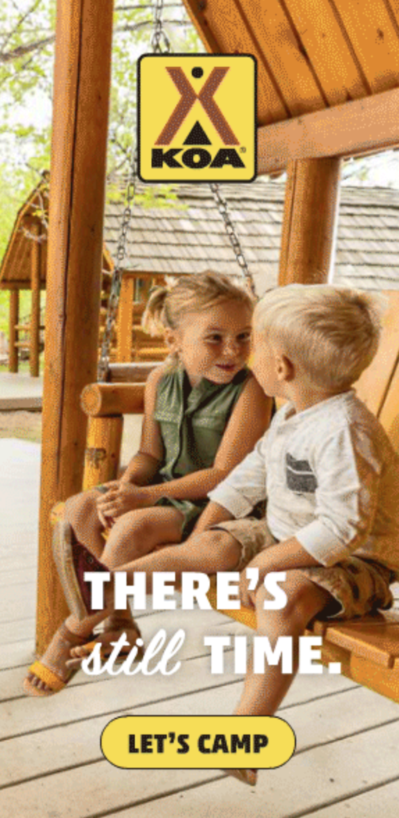 KOA's mission is to connect people to the outdoors and each other. However, they needed help attracting visitors during the shoulder season, a time when interest in camping traditionally decreases. Despite the cooler weather, KOA aimed to encourage families to embrace the outdoors, reassuring them that 'there is still time' to get out. I collaborated with a creative director and marketing expert to develop banner ads and social media posts for KOA's shoulder season campaign. Our goal was to promote camping during this off-season with the catchy headline 'There's Still Time' to engage viewers. I closely worked with the creative director on ad design, while they managed HTML banners with animations, and I also handled static social media posts.